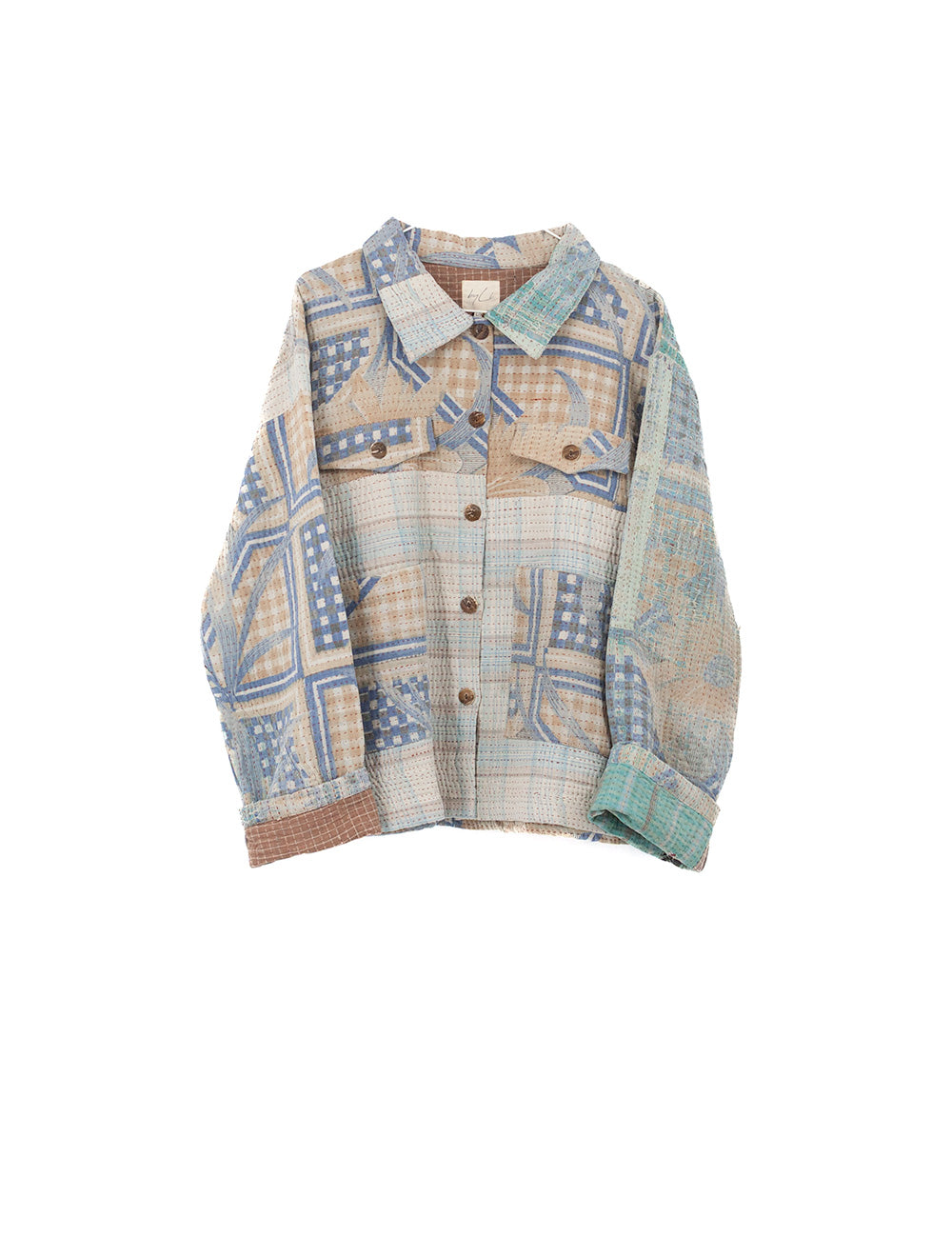 Kort kantha-quiltet jakke af genbrugte smukke håndsyede bomuldstæpper i forskellige farver og udtryk. Jakken har et slidt udtryk, hvor indvendige stoflag nogle steder træder frem og giver jakken et meget unikt udseende. Jakken har ”4” synlige lommer på fronten, 2 udvendige lommer nederst på fronten samt 2 brystlommer til pynt med flap og træknap. Jakken har desuden klassisk skjortekrave og synlige træknapper i hele længden.