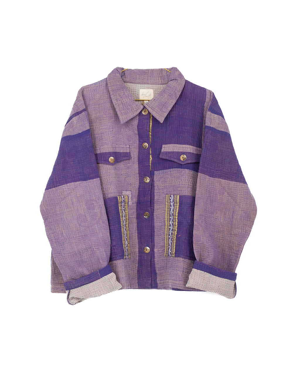 Kort kantha-quiltet jakke af genbrugte smukke håndsyede bomuldstæpper i forskellige farver og udtryk. Jakken har et slidt udtryk, hvor indvendige stoflag nogle steder træder frem og giver jakken et meget unikt udseende. Jakken har ”4” synlige lommer på fronten, 2 udvendige lommer nederst på fronten samt 2 brystlommer til pynt med flap og træknap. Jakken har desuden klassisk skjortekrave og synlige træknapper i hele længden.