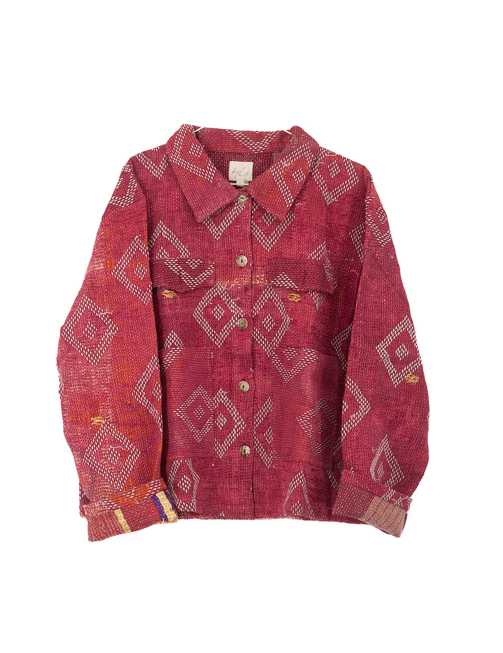 Kort kantha-quiltet jakke af genbrugte smukke håndsyede bomuldstæpper i forskellige farver og udtryk. Jakken har et slidt udtryk, hvor indvendige stoflag nogle steder træder frem og giver jakken et meget unikt udseende. Jakken har ”4” synlige lommer på fronten, 2 udvendige lommer nederst på fronten samt 2 brystlommer til pynt med flap og træknap. Jakken har desuden klassisk skjortekrave og synlige træknapper i hele længden.