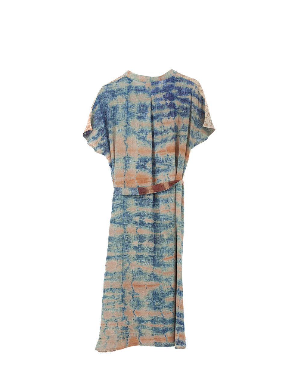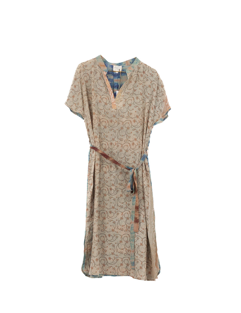 Emma kjolen med det enkle design er lavet af nøje udvalgte genbrugte indiske silke sarier. Af hver sari kan der kun laves 1-2 kjoler, hvilket gør hver kjole til et unika. Emma kjolen har bell ærmer og V-hals, samt 2 skjulte lommer siden og en lille slids med afrundede hjørner i begge sider. Derudover har kjolen et smalt aftageligt bælte og 2 små bæltestropper i siden.