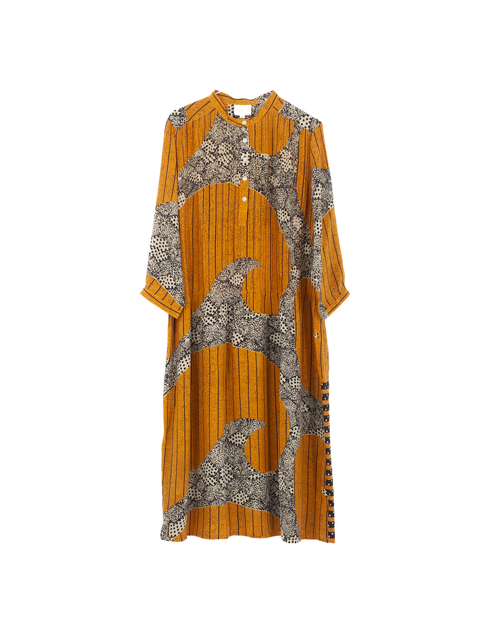 Selma kjolen har halve ærmer til over albuen, plisseret front og ryg og kinakrave. Derudover har kjolen skjorteknapåbning øverst på fronten.