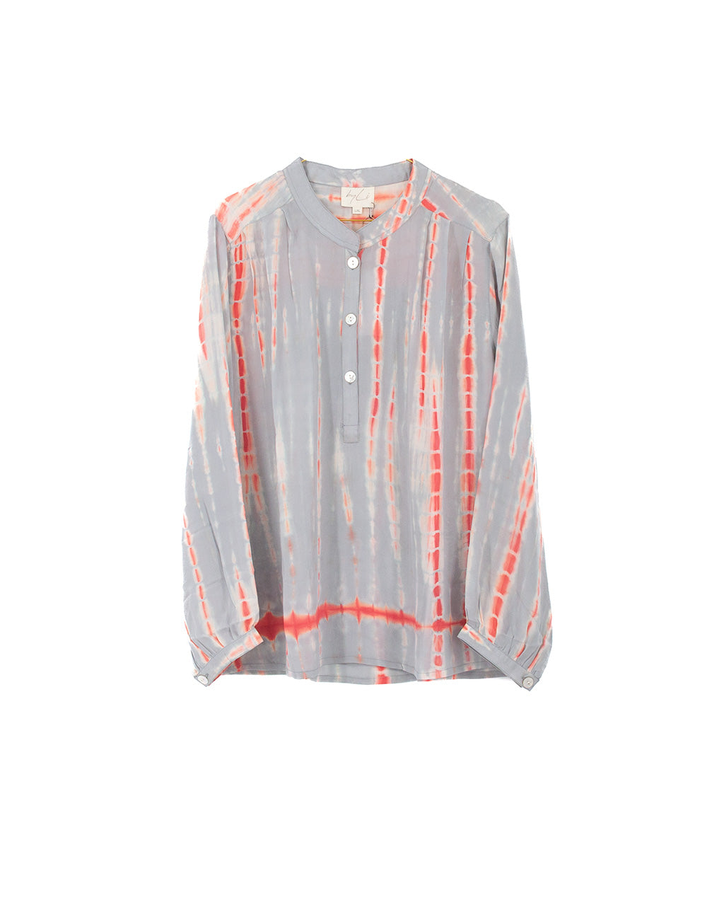 The Anne Maria blouse has long sleeves with buttons at the bottom. It has a half button closure on the front and a chin collar design. It is slightly longer at the back than at the front.