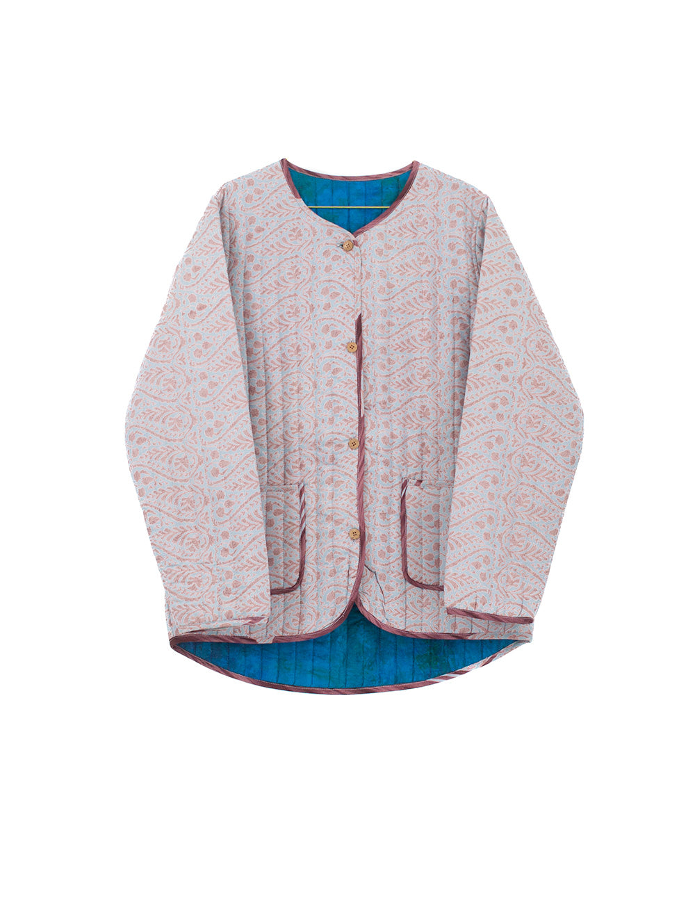 Short quilted jacket made from recycled Indian silk saris. The jacket is