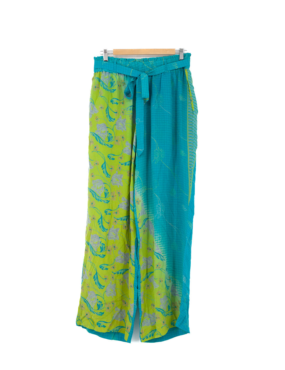 Beautiful loose summer trousers in pure crepe silk. The trousers have wide legs, a wide elastic waist and a loose tie. In addition, the trousers have internal pockets and are sewn from recycled Indian silk saris.