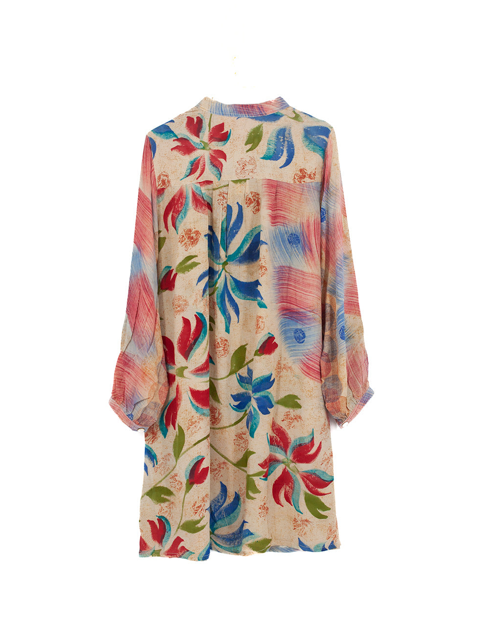 Denne charmerende og afslappede skjortekjole er lavet af genbrugte indiske silke sarier. Selvom den er fremstillet af de fineste materialer, kan stoffet have små tegn på at være brugt. Dette gør hvert design helt unikt og med sin egen særlige historie. Vi håber du vil bringe historien videre med kærlighed og respekt.