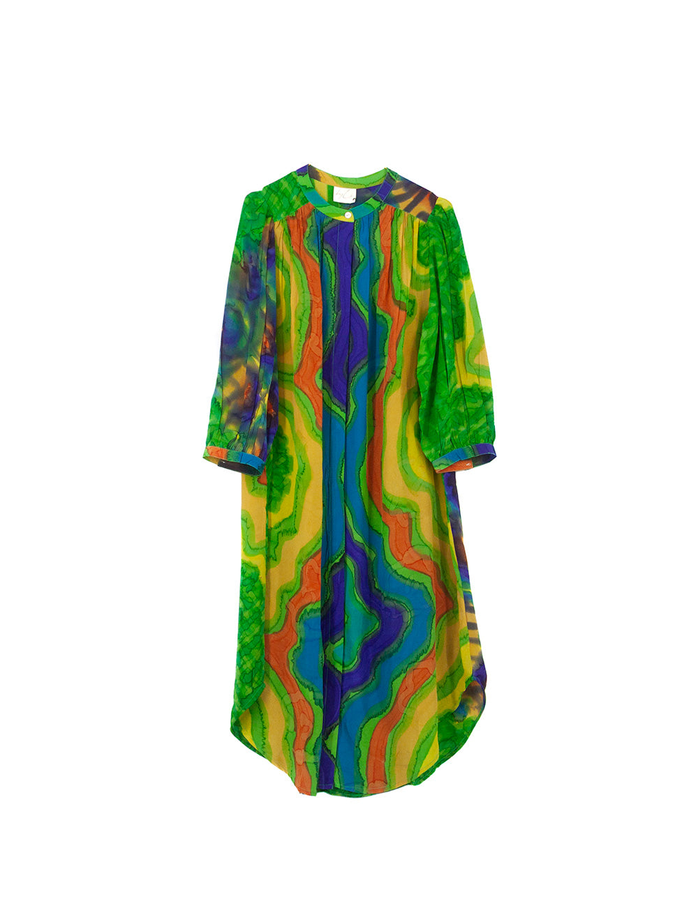 Dorte tunikaen er lavet af genbrugte indiske sarier af ren silke. Selvom den er fremstillet af de fineste materialer, kan stoffet have tegn på at være brugt. Dette gør hvert design helt unikt og med sin egen særlige historie. Vi håber du vil bringe historien videre med kærlighed og respekt