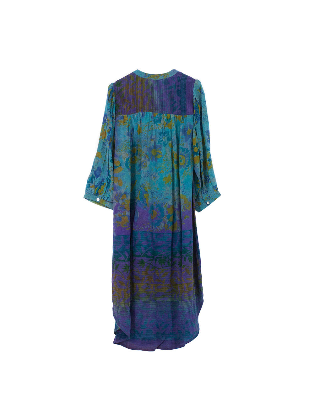 Dorte tunikaen er lavet af genbrugte indiske sarier af ren silke. Selvom den er fremstillet af de fineste materialer, kan stoffet have tegn på at være brugt. Dette gør hvert design helt unikt og med sin egen særlige historie. Vi håber du vil bringe historien videre med kærlighed og respekt