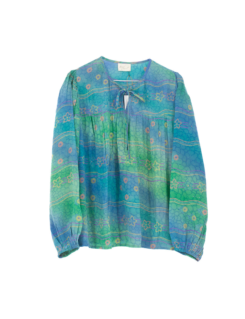 Helene blusen er lavet af genbrugte indiske sarier af ren silke. Selvom den er fremstillet af de fineste materialer, kan stoffet have tegn på at være brugt. Dette gør hvert design helt unikt og med sin egen særlige historie. Vi håber du vil bringe historien videre med kærlighed og respekt