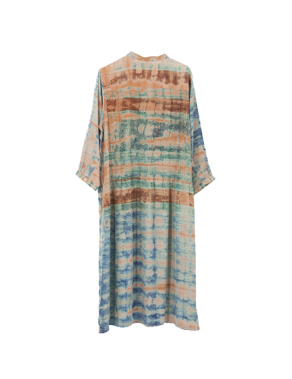 Selma kjolen har halve ærmer til over albuen, plisseret front og ryg og kinakrave. Derudover har kjolen skjorteknapåbning øverst på fronten.
