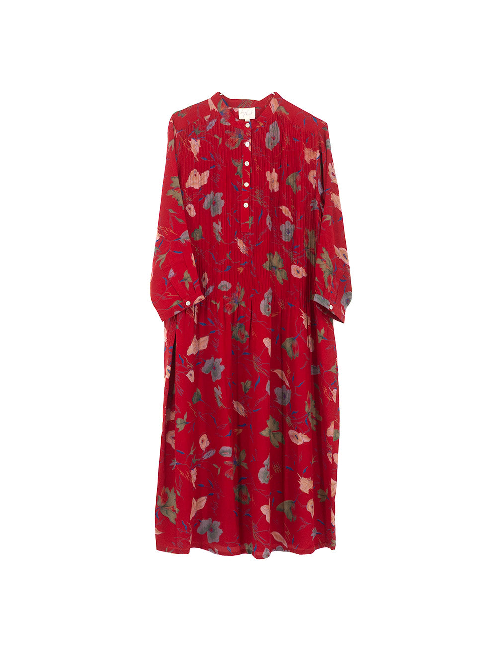 Selma kjolen har halve ærmer til over albuen, plisseret front og ryg og kinakrave. Derudover har kjolen skjorteknapåbning øverst på fronten.