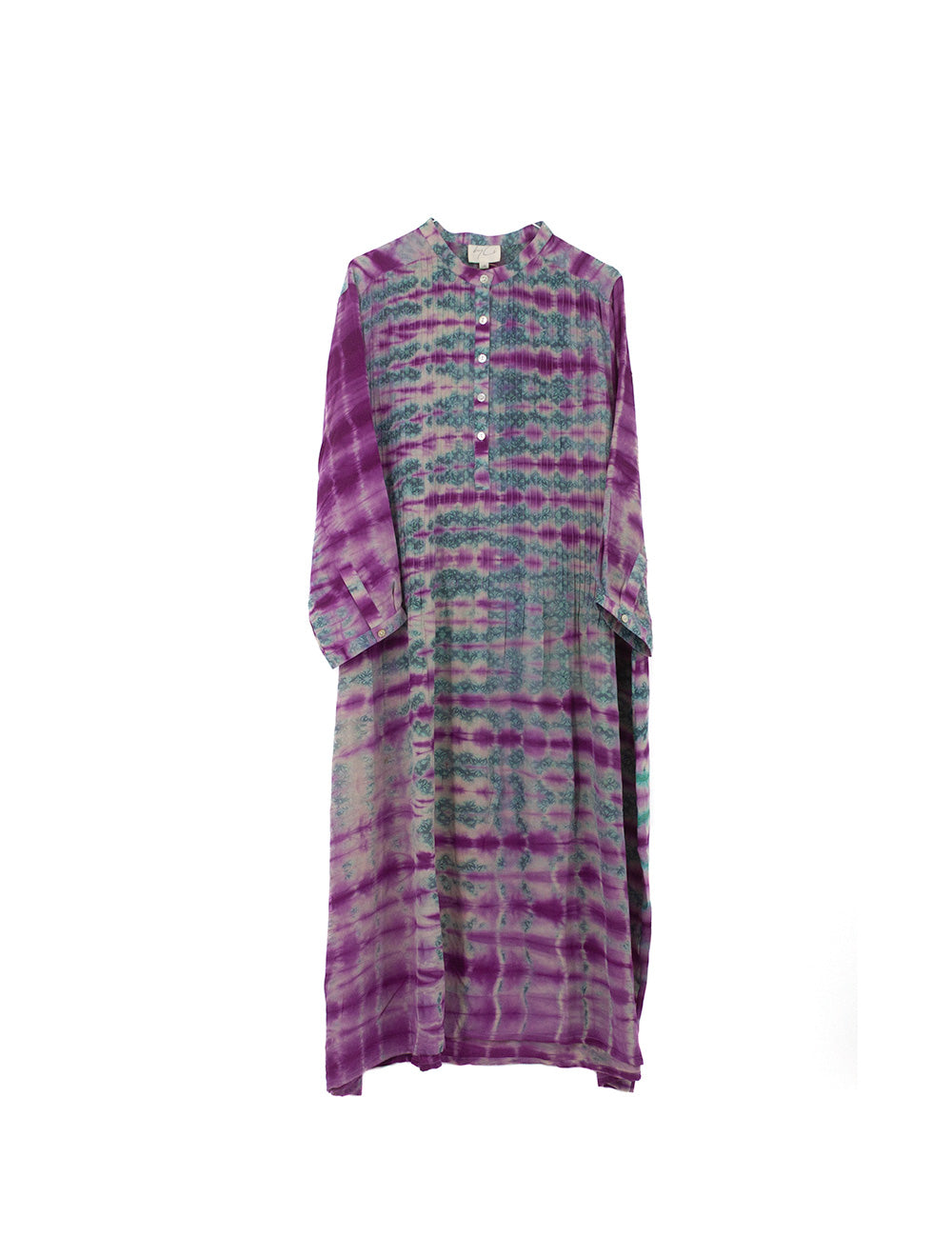 Selma kjolen har halve ærmer til over albuen, plisseret front og ryg og kinakrave. Derudover har kjolen skjorteknapåbning øverst på fronten.